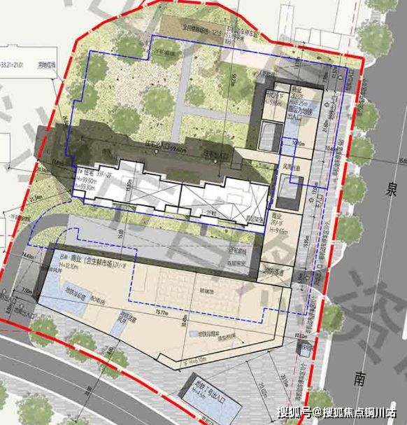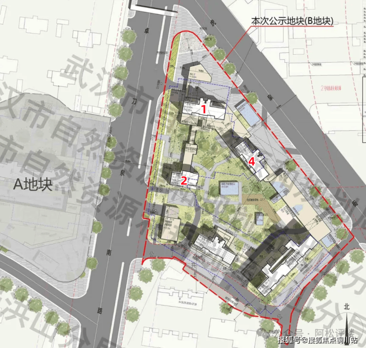 该地块形状不规则,5栋住宅呈围合式结构,1、2号楼为南北朝向,3、4号楼则是南偏西朝向,4号楼几乎是东西朝向。