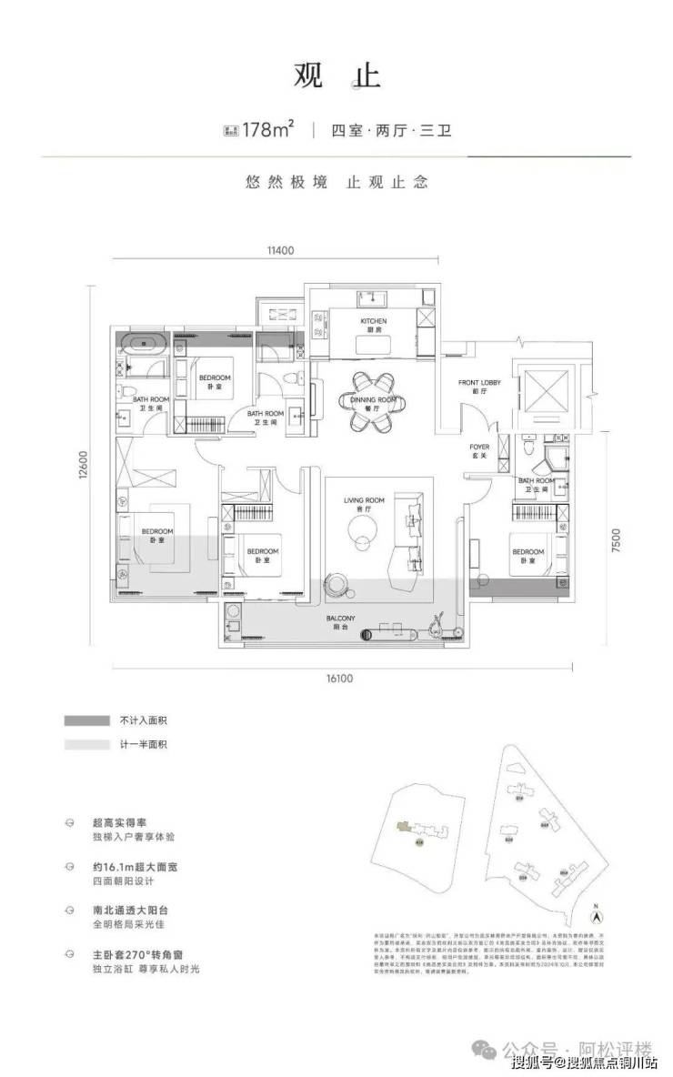 建面约178平户型,优化后得房率约94%。独立电梯前室入户,双套房,厨房开间比较大。该户型属于早期比较常规的四代户型,除了阳台相对于三代略大一些,其他并无设备平台、花池等优化赠送,是常规的大开间南北通透结构,也不如B地块户型来的有创意。