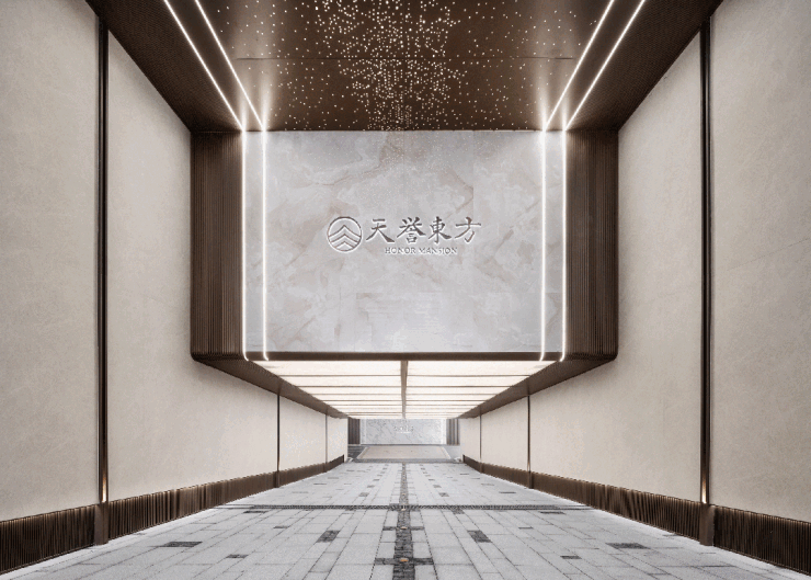 超长府院门庭,恢弘大气。蓝翡翠奢石、3D钻石星光穹顶天幕、高定万字纹仿古铜地雕,入口处的每一步都辉映着业主的尊贵身份。