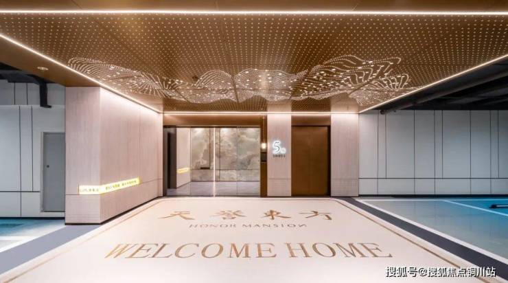 单元门甄选名贵石材搭配香槟金铝板,入户大堂精选翡翠绿岩板,顶部3D圆弧吊顶,一路星光温暖业主回家的路。