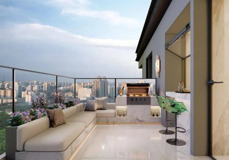 这样的生活场景极具魅力,在露台设置户外烧烤炉与舒适餐桌,烹饪、传递、享用美食仅在转身之间。