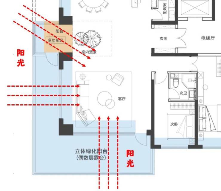 而绿植后与露台相连部分,可以放置洗衣机、户外桌椅等,或是改阳光书房、茶室等兴趣空间,兼容日常需求。