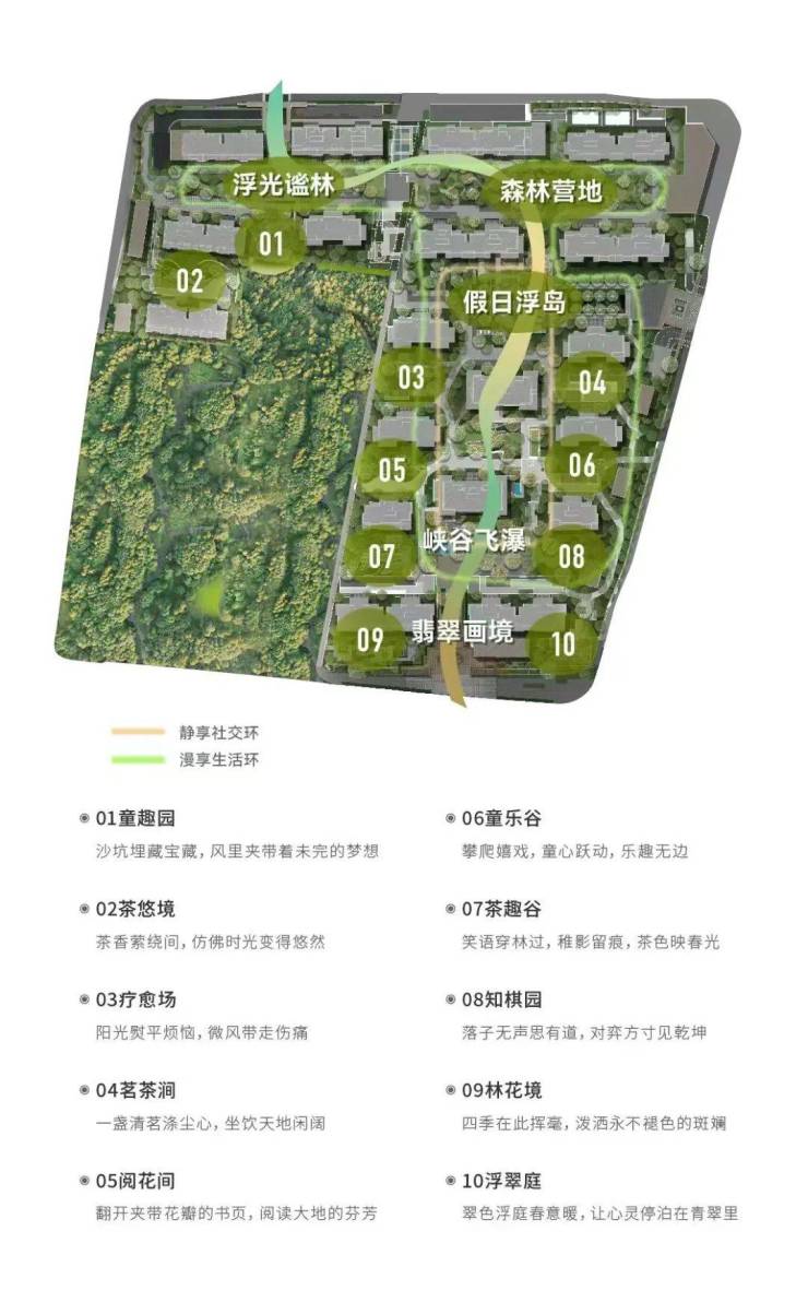 整个园林围绕让度假感浸润日常,设计了浮光谧林、森林营地、假日浮岛、峡谷飞瀑、翡翠画境五大洲主题园林,以一轴双环串联,确保景致常新、风情各异。