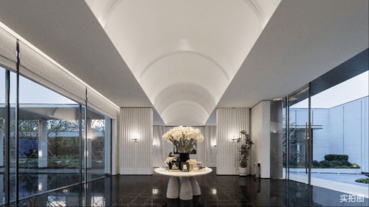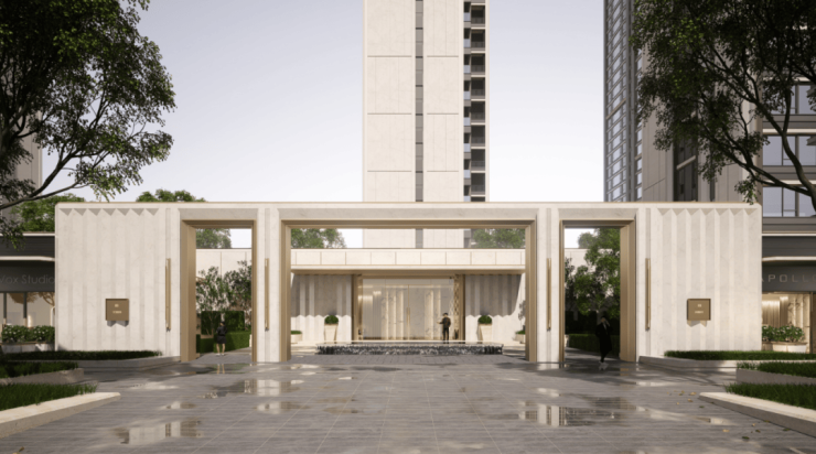 项目汲取顶奢酒店的雅奢理念,门庭呈现仪式感和隐奢感,匹配从世界归来的居者从容气质。在建筑立面上提炼江城建筑、人文、自然之精华,聚焦长江流金的意向,让建筑仿佛垂立于城心的一抹长江金。