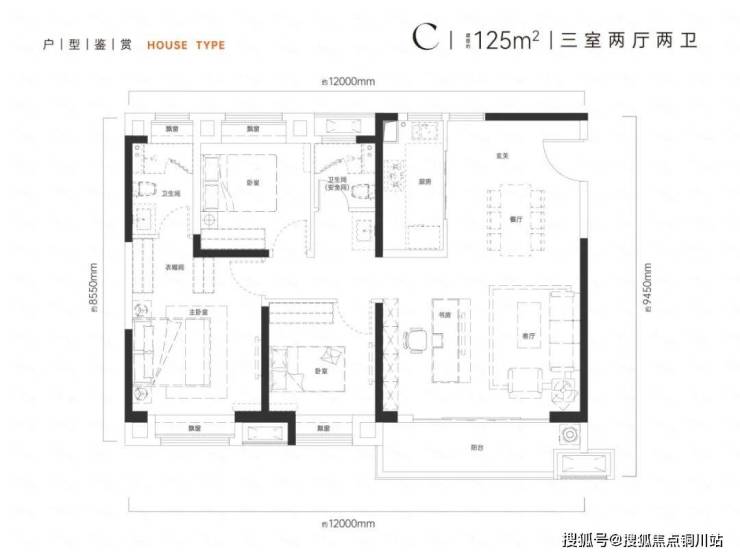这个户型跟97㎡的一样,都拥有超 6 米南向景观阳台。另外整体是短进深大面宽的设计,和市场上有些项目 110 ㎡ 面积段长进深的户型相比,采光面更大,室内能够接收到的自然光时间更长。更难得的是,这个户型是个边户,目前市场上边户多是 120 ㎡ 以上面积的户型,相对来说,质价比更高。