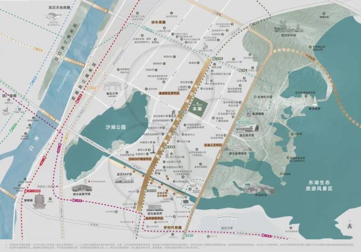 休闲配套:项目地处两湖绿肺之间,西侧约 700 米左右就是沙湖,东侧约 1000 米左右就是东湖,1 公里内还有湖北美术馆、省博物馆等人文休闲配套。