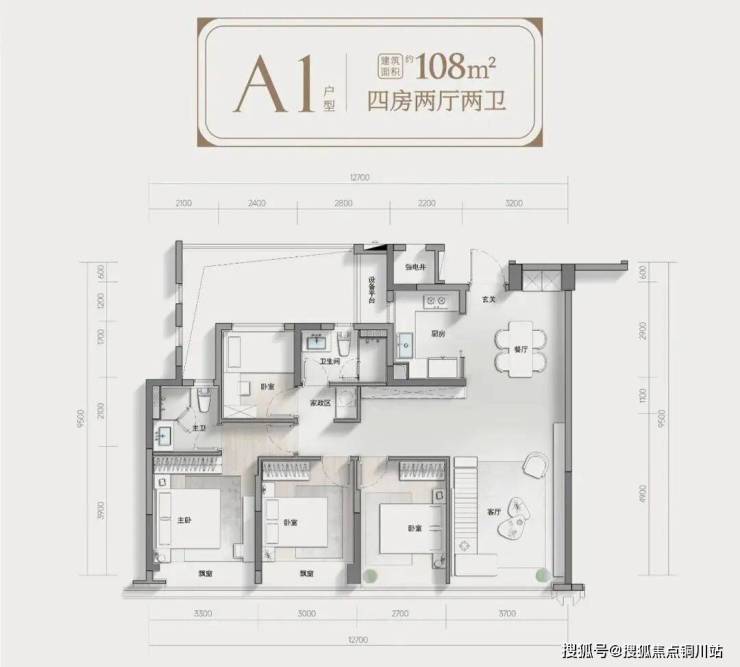 君潮润府最大的亮点莫属于其超高的空间利用率,其中建面约108㎡中间套突破传统格局,在同面积段传统仅能做三房的情况下实现四房布局,打造了四室两厅两卫全能空间,满足家庭全周期需求,并且该户型得房率高达96%。