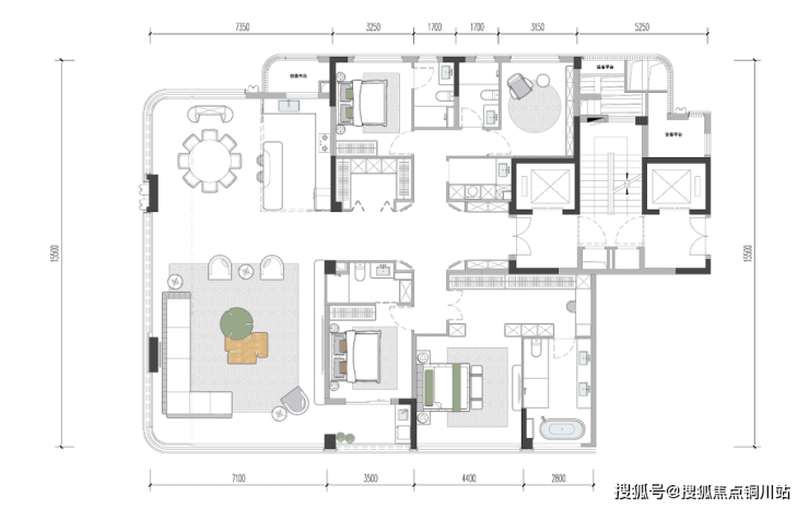 面宽约4.4米的霸气主卧套房,联通衣帽间、梳妆台和独立卫生间,让卧室小家化。此外,还有面宽约3.2米的高配三套房以及预留独立家政间,动线科学、尺度阔气。