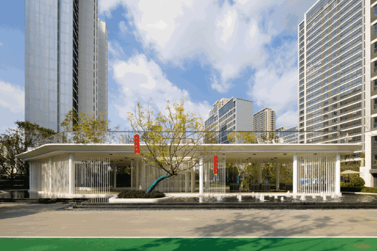 枝干婀娜的乌桕、圆满宽广的丛朴、郁郁青青的草坪...社区内大量绿色珍植,清澈水流潺潺而下,形成郁郁葱葱、层次丰富的景观。