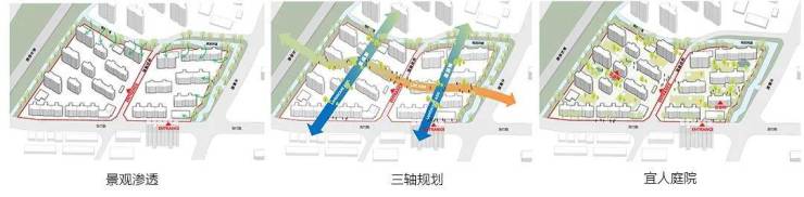▲有限地块内,五栋小高层沿北侧与西侧围合布局,屏蔽不利因素。左右两地块内部形成南北向景观轴线,东西向串联成生活轴线,构建大面宽、约1.8低容积率的水岸洋房住区。