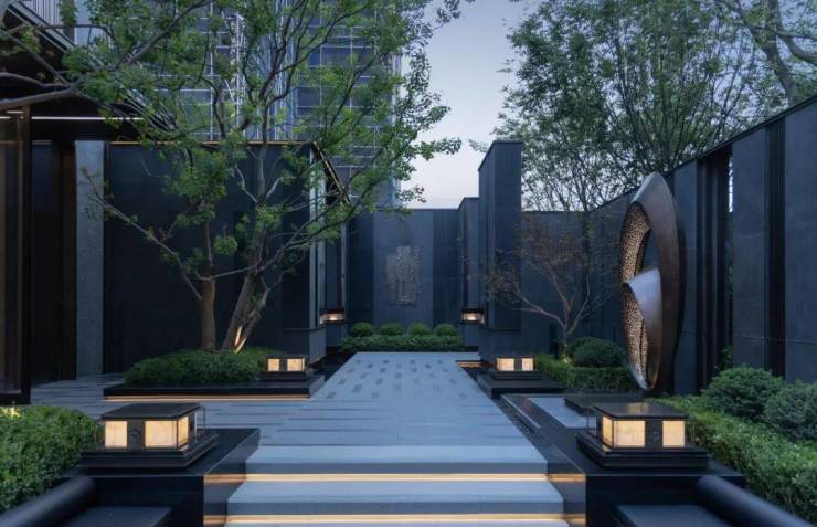 高辨识度的宝石雕塑拉开入院的序幕,其后景墙,以“实”的温润石材和‘虚“的熠熠金属勾勒出归家的雍容和尊贵感。