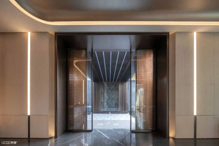 大堂门厅,采用古铜金属格栅搭配内嵌式氛围灯带,贴面的暖木色调勾勒自然木纹肌理,整体折射出温润温馨的美感。