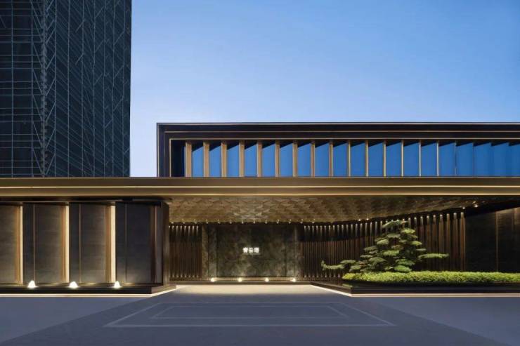 二层运用折板玻璃打造韵律感,大尺度檐角出挑,边沿灯光雕刻出其黑金质感,在树影映衬下,藏纳岁月流光。