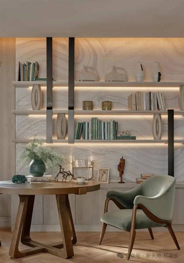 夹层被安置成了书房,安静、雅致,为了显露对生活的慰藉,像是把精神世界现实化的地方,展现修养、审美甚至家风。也如三毛在《送你一匹马》中所说:“许多时候,自己可能以为许多看过的书籍都成过眼烟云,不复记忆,其实他们仍是潜在的。”