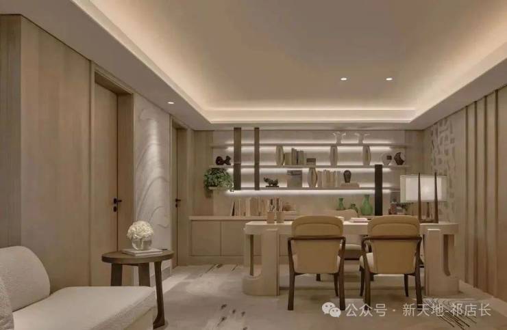 室内陈设遵循少即是多的东方禅意,手作陶器与当代雕塑在灰调中形成材质张力,让艺术装置成为空间的呼吸器官。