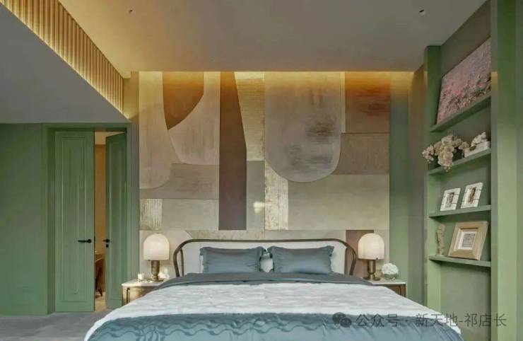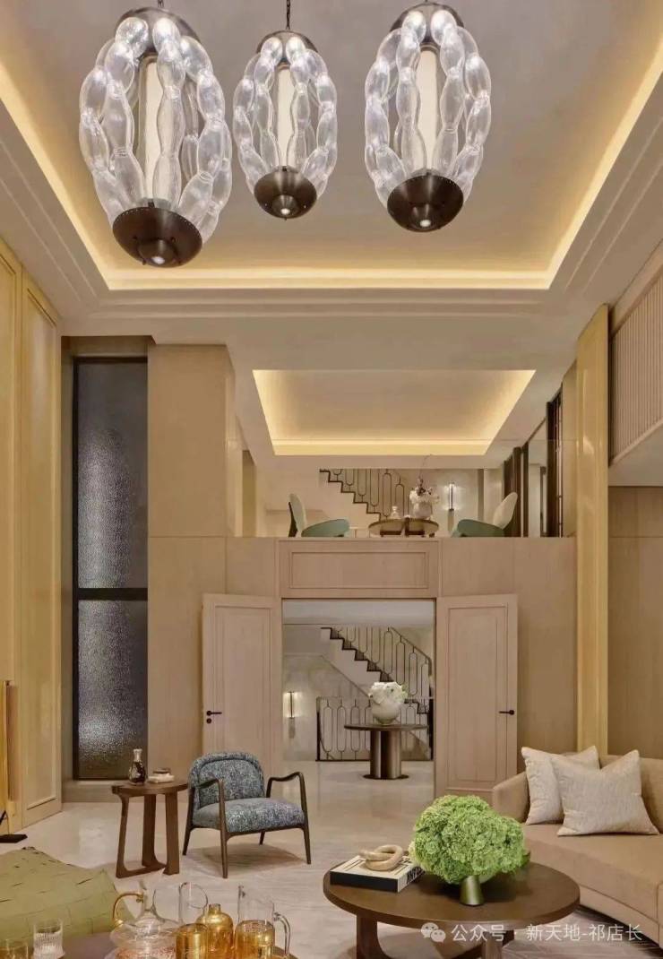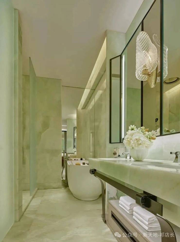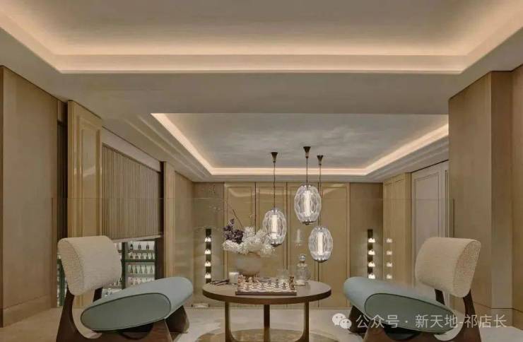 顶层下午茶区以淡绿为底,壁炉暖光漫过手绘地毯的肌理,将社交场域沉淀为冥想容器;主人房墙面缟玛瑙(Onyx)的天然流痕,也与一层屏风暗纹形成时空对位,光影在矿物晶体中生长出私密的诗。