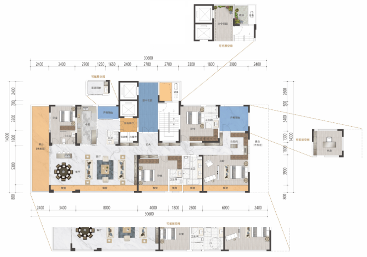 创新性地将大平层、别墅和四代宅的优点融合,实现大平层+空中墅居体验: