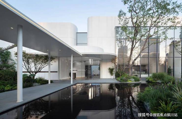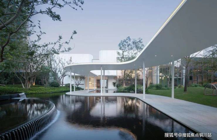 生活馆与社区入口之间围合一块三角形用地,两个主体之间利用风雨连廊衔接,保证人流到达的舒适度和便捷性。连廊围绕三角形用地蜿蜒展开,一侧水波粼粼,一侧碧草绿荫。在有限的动线长度,尽可能让客户感受到自然所带来的愉悦感。