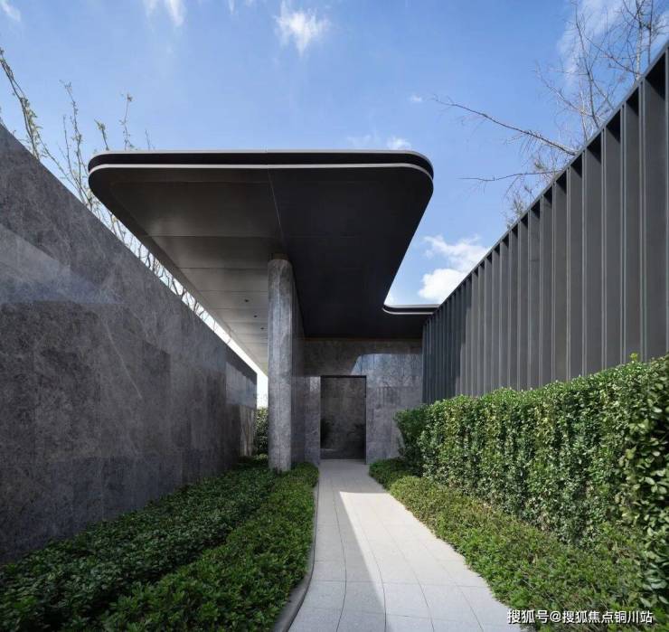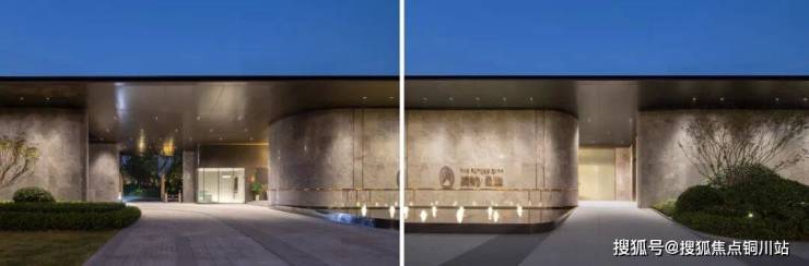 社区入口采用意大利灰大理石作为墙面主材料,密缝拼接,铺陈出沉静而雅致的氛围气息,屏蔽掉城市的喧嚣。主要墙面及材料交界处分别设计了古铜色金属线条和凹槽。倒圆角的设计,让整个门头显得更加温润而亲切。