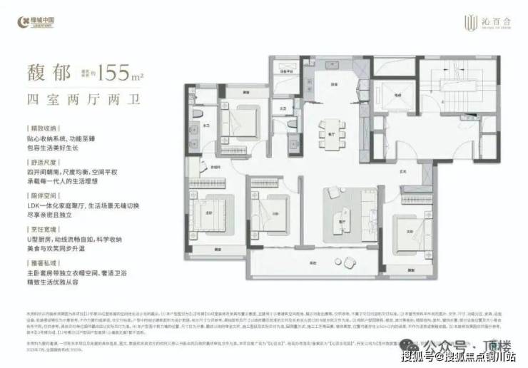 👉155㎡四房两卫:南向面宽14.1米,独立玄关+U型厨房,主卧开间3.5米,外接7.5米宽景观阳台;