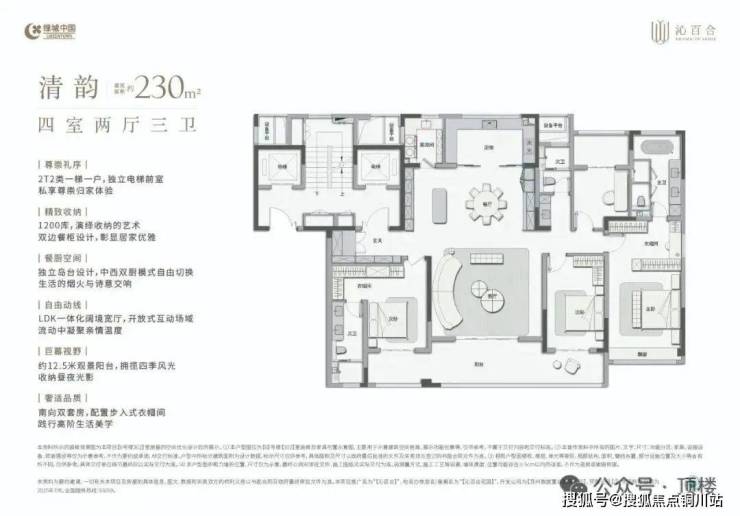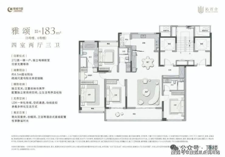 👉183㎡四房三卫:南向面宽15.9米,客厅开间达5.7米,主卧开间近4米,南北双阳台+LDKB一体化设计,双套房配置;