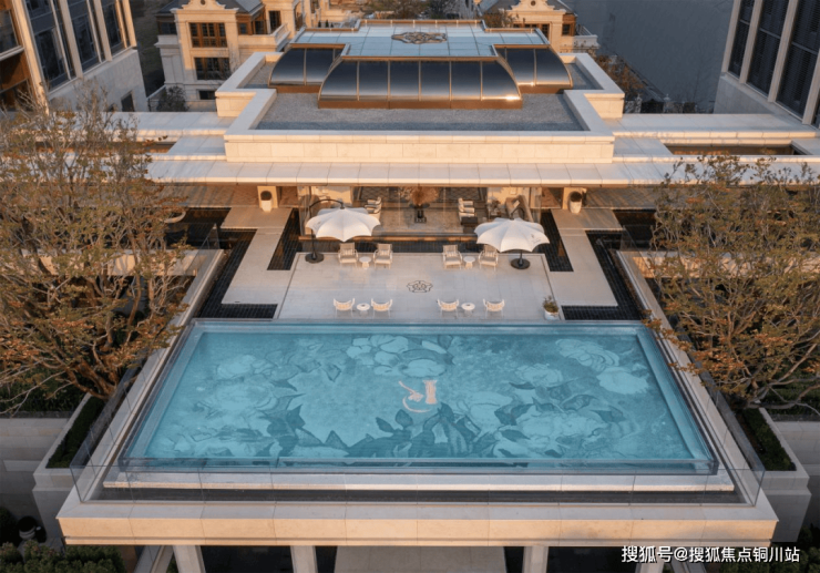云栖玫瑰园的合院广泛采用金沙黄石材干挂立面,不仅因其色调清雅沉稳,更因其经得起时间磨砺,正如雨果所言,“建筑是石头写就的史诗”。崇尚法式建筑或生活方式的人,本质上锚定了精英人群对贵族式优雅与浪漫艺术气息的追慕,对“高级文明”精神世界升华的深层需求。某种意义上说明,绿城嘉兴云栖玫瑰园的出现,满足了人们对“出众品质”与“城市价格天花板”符号的渴望,确保其成为“不言自喻的身份感”。如极具视觉冲击力的“悬浮空中泳池”,池底以24K纯金镶嵌logo,是将奢华融入艺术感转化为可传播的奇观式场景,精准触达目标客群独特性需求——家族荣耀的传承与历久弥新的尊贵。