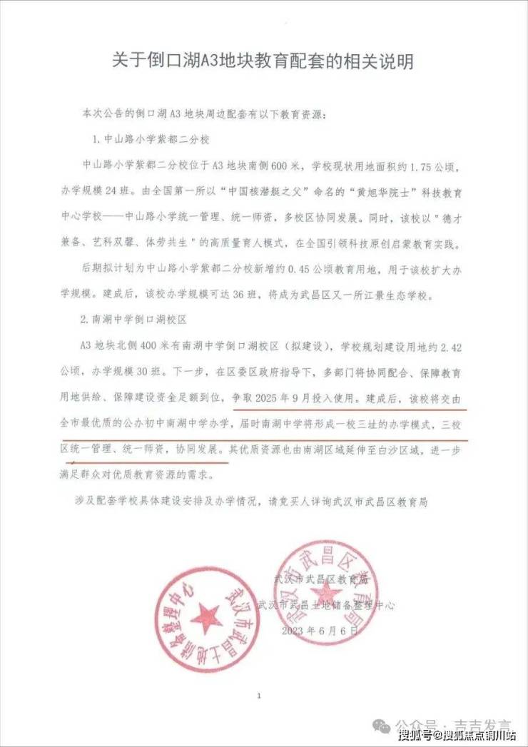 自带一所9班幼儿园,周边两所中山路小学分校,同时南湖中学倒口湖校区正式落户国铁·印江澜北侧,2024年10月30日南湖中学倒口湖校区概念方案征集活动正式启动;2024年12月5日学校概念方案预审会议顺利举行,2024年12月25日,学校概念方案征集专家评审会成功举办。