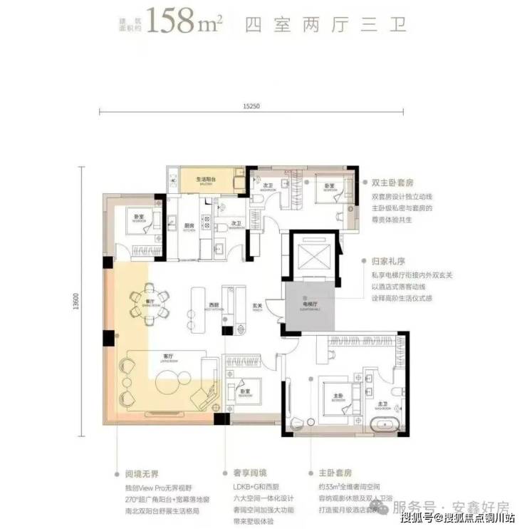 项目容积率仅2.5,为准四代产品,外立面采用大面宽玻璃幕墙与质感铝板,户户独梯入户;并配置了目前室内罕见的阳台外花池,270度天幕观景,得房率高达106%。