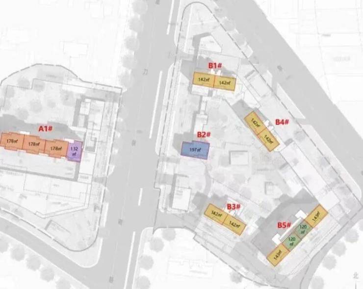 B1#、B3#、B4#都是17层的小高层,2梯2户,户型分别是143-143㎡;B5#是33层,2梯4户连廊结构,户型分布为143-120-120-143㎡;B2# 是11层的小高层,1梯1户,197㎡大户型;A1#是2个单元,每个单元都是2梯2户,户型是178-178-178-132㎡。