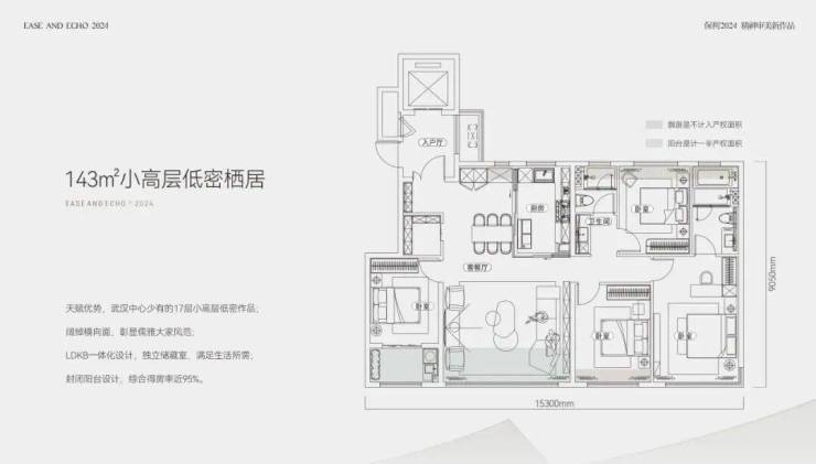 首开的143㎡小高层户型,四房两厅两卫,南向面宽高达15.3米;四开间朝南,客厅开间约5.4米;阳台进深约2.1米,双阳台再加上全赠送的飘窗,优化后得房率约95%,如果再加上约6.6㎡的电梯前室,得房率高达99%。