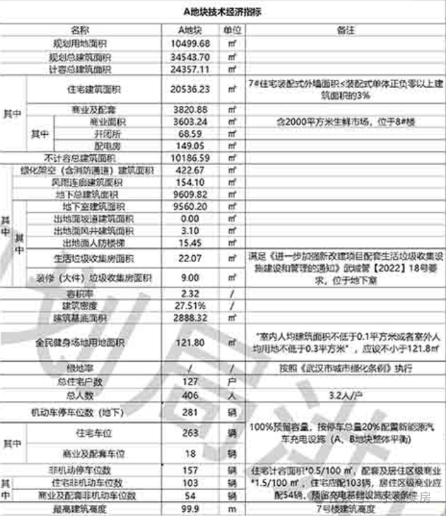 A地块规划用地面积约1万方,总建面约3.45万方,住宅建面约2万方,容积率约2.32,总户数127户,住宅机动车停车位263个。