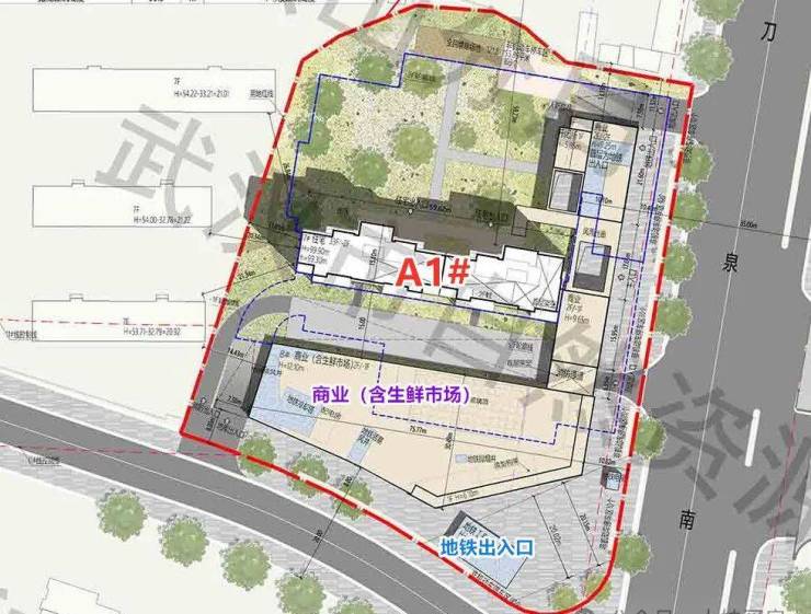 A地块还带有一个2000㎡生鲜市场,在地块的东南角还有一个地铁出入口。
