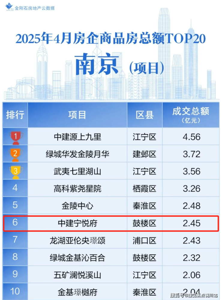 据金刚石房地产云数据显示,4月南京楼市销售金额排行榜单中,中建·宁悦府以2.45亿的销售成绩排名全市第6,鼓楼第一!实力强劲!
