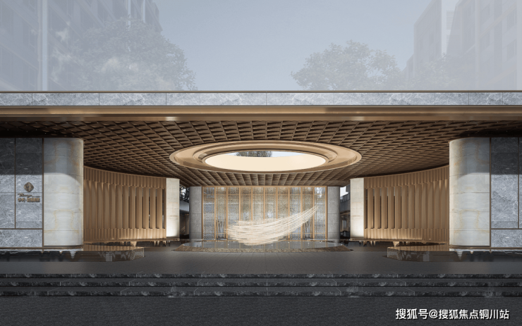 大门中央是暖色调的环岛式落客区,围绕焦点雕塑形成洄游动线。弧形动线大面积用金属铝板包裹,顶部是菱形金属板构筑的顶棚,暖色调与灰色调的景墙、黑色地面铺装形成色彩变化的同时,强调归家的温馨感受。