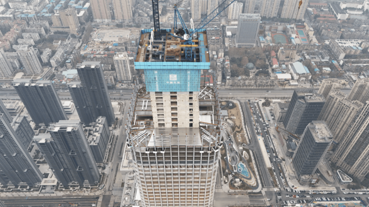 这座武汉第三高楼的崛起,离不开中建三局自主研发的第四代轻量化"空中造楼机"。这个自重800吨的"国之重器",配备12台液压油缸和集成化作业平台,覆盖钢筋绑扎、混凝土浇筑及养护三层同步施工,将传统超高层建筑效率提升20%以上。