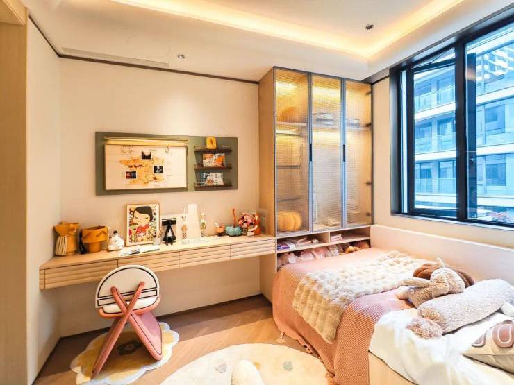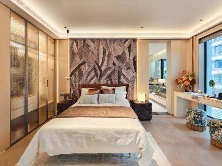 主卧施工,我们以毫米级的精度安装格栅落地玻璃窗,兼顾视觉通透与结构稳固;弧形纹样木饰面经手工多层雕琢与精准拼接,确保线条流畅、光影柔和。每一处细节均源自对比例、材质与工艺的反复推敲,以精工之艺,雕琢出静谧而奢雅的休憩空间。