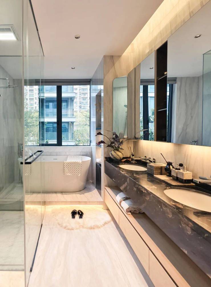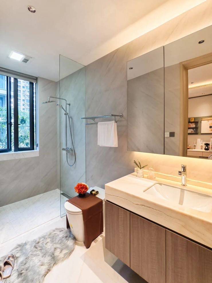 卫生间采用大尺寸石材无缝铺贴,对选材纹理、切割精度与现场施工均提出极高要求。我们通过数字化预排版与手工精细调平,实现毫米级缝隙控制与镜面般平整效果,让石材的肌理在静谧空间中完整展现其高级气韵。