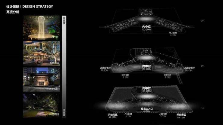 “立体”作为空间策略,通过空中连廊、地下空间等立体交通有效拓展了空间维度。而面对更为纷繁的人群与业态,“多维”的策略则指向一种深度复合的体验。项目匠心融入城市客厅、艺术中心、商业街区等多元业态,旨在激活一个全天候的活力社区,既服务于项目使用者,亦为市民提供独具一格的体验与便利。如何以灯光为笔,将不同维度的空间熔铸一体,同时又能因境生辉,为各空间定制专属的光环境,便成为本项目灯光设计的核心命题。