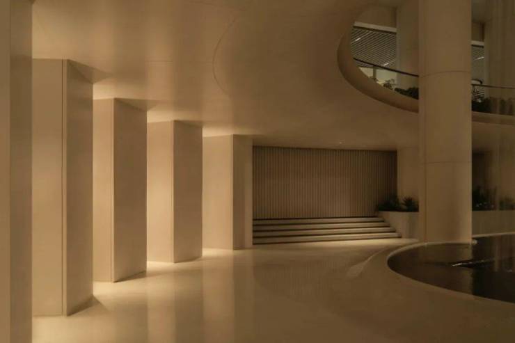 项目依傍武昌湾长江之畔,建筑本身亦将水元素层层浸染于不同空间——从江岸到水院,由飞瀑至镜池。灯光妙笔生花,将微波光影流转于天花与立面之上,时而粼粼跃动,时而激越奔流,时而静谧如渊,恰如其分地呼应着每一处多维空间的独特气质。