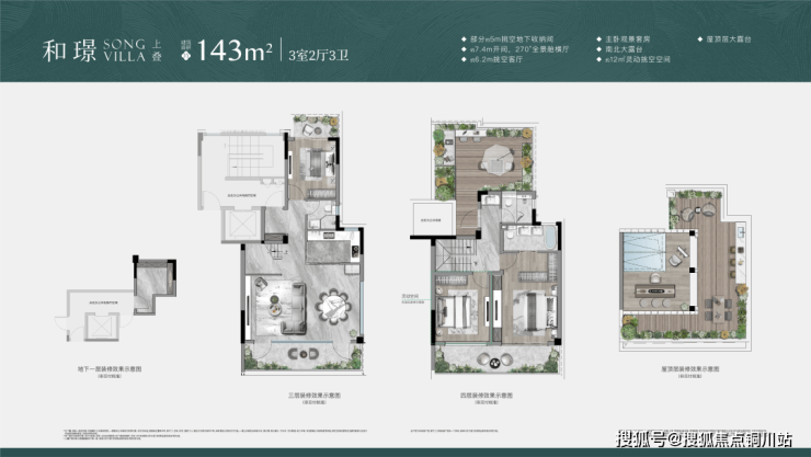 上叠143m²户型3房2厅3卫,赠送客厅挑高、南北双露台及星空屋顶大露台,轻盈而通透。