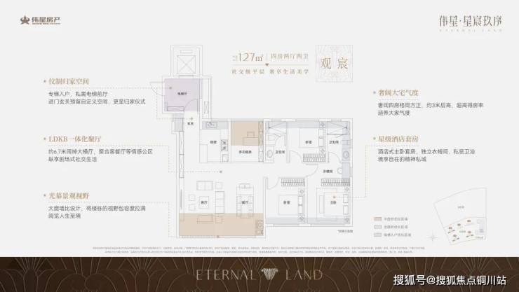 建面约127㎡的标准四房,客餐厅开间达6.7米,视野开阔,完美满足家庭成长过程中的居住需求。