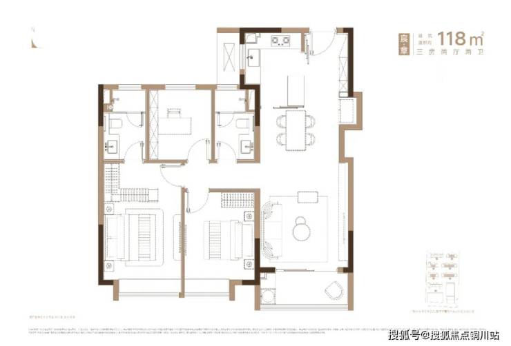 建面约118㎡户型,三开间朝南,主卧套房设计。当下很流行的S墙、厨房岛台,该户型也都有,格外适合一家三口居住。