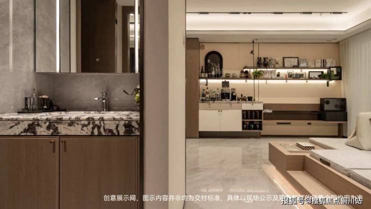 细节上,餐厅飘窗上的柜子是交付的;岛台靠餐客厅一侧也做了开放式的收纳,配了升降插座;