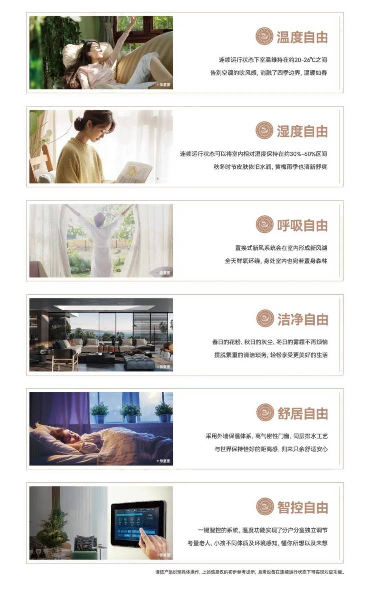 再加上可以自由控制每个房间的温度湿度等的分户式科技系统,告别空调吹风感,带来四季如春的温暖感受,保持皮肤水润,梅雨季也无惧潮湿...真正实现空间审美和舒适享受的居住体验。