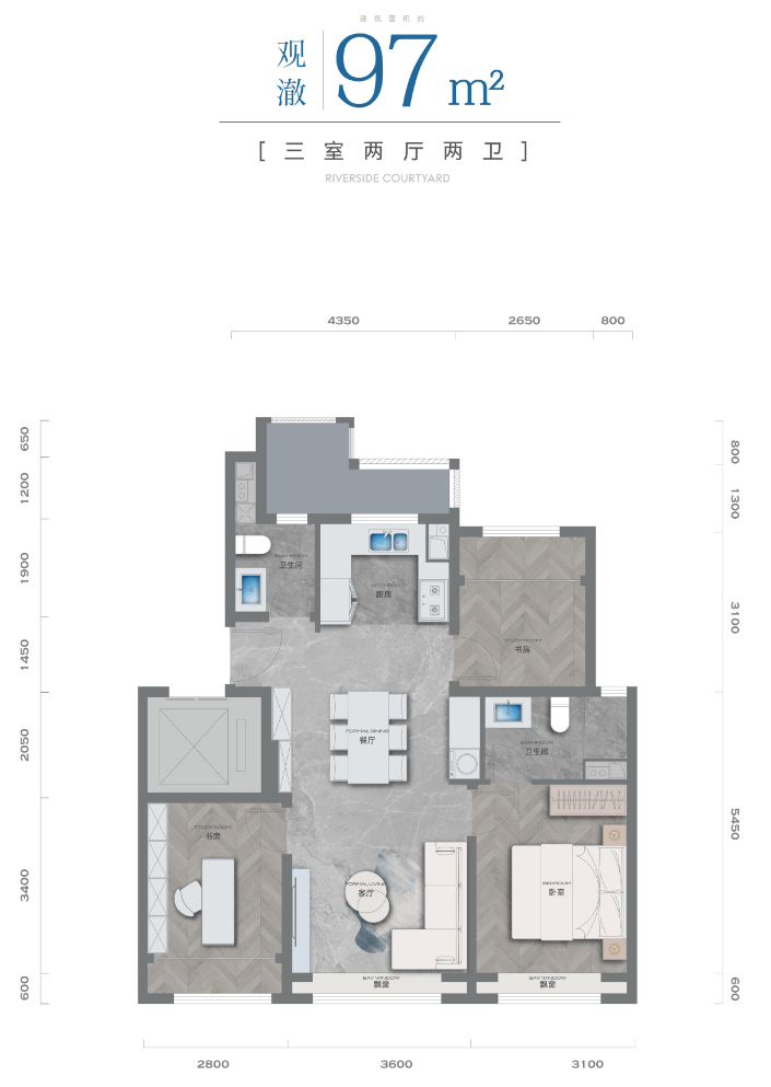 2号院小高层建面约97㎡三室两厅两卫户型,南向整体面宽约9.5米,搭配时下流行的落地窗设计,客厅兼具舒适尺度和颜值享受。南向两飘窗,赠送空间充足,主卧采取套间+明卫设计,居住舒适性更高。对首置群体来说,这款户型从空间到总价,都很友好。