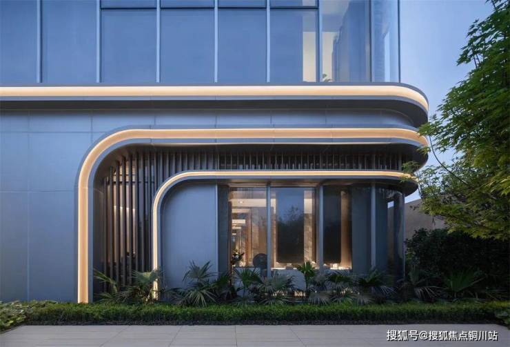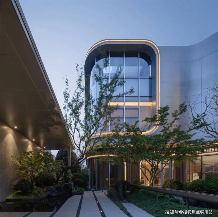建筑主体以银灰色金属和超白玻璃为主要材料,配合曲线造型,彰显现代性与时尚感,赋予建筑更多的浪漫色彩。暖色穿孔铝板大面积运用在面对城市的界面,配合星座造型的点点灯光,仿佛社区里万家灯火的汇聚。