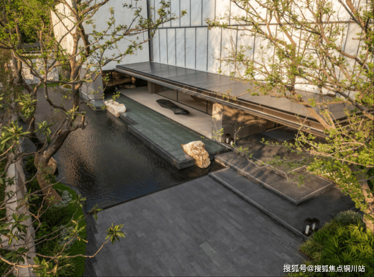 下沉式庭院有5米飞瀑与森系会客厅,庭院通过高差变化与围合空间的处理,打造一处隐秘户外场所,层次感很丰富