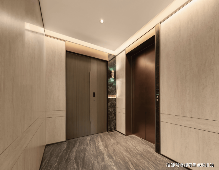 建面约125㎡样板间,从大堂的石材铺装,到一梯两户穿梭梯配通力无机房电梯,从电梯的非遗「绒花」金属印花门体,到酒店式门牌镶嵌「百达翡绿奢石」,从约8㎡的入户门厅,到约2.38米高的铸铝子母门……无一不体现归家仪式感和私属体验,整体开阔大气,静谧中不失温度。