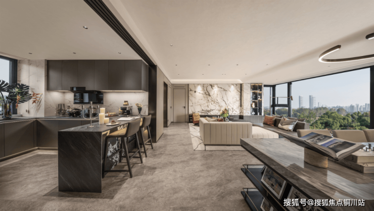 可以直观感受其媲美大平层的尺度:约6.6米横厅开间、三卧均超3米、近10㎡U型厨房,窗墙比约0.54-0.58,极大提升采光与视野