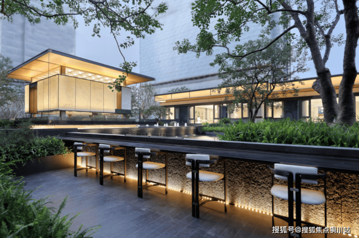 视觉的焦点是一场精心编排的东方叙事:中央镜面水景中,涌泉不息,其潺潺声息宛如一首欢迎曲;水中静立的一株日本冬青,以生命的绿意与稳定的形态,与水景构成一幅“动静相宜”的写意画。